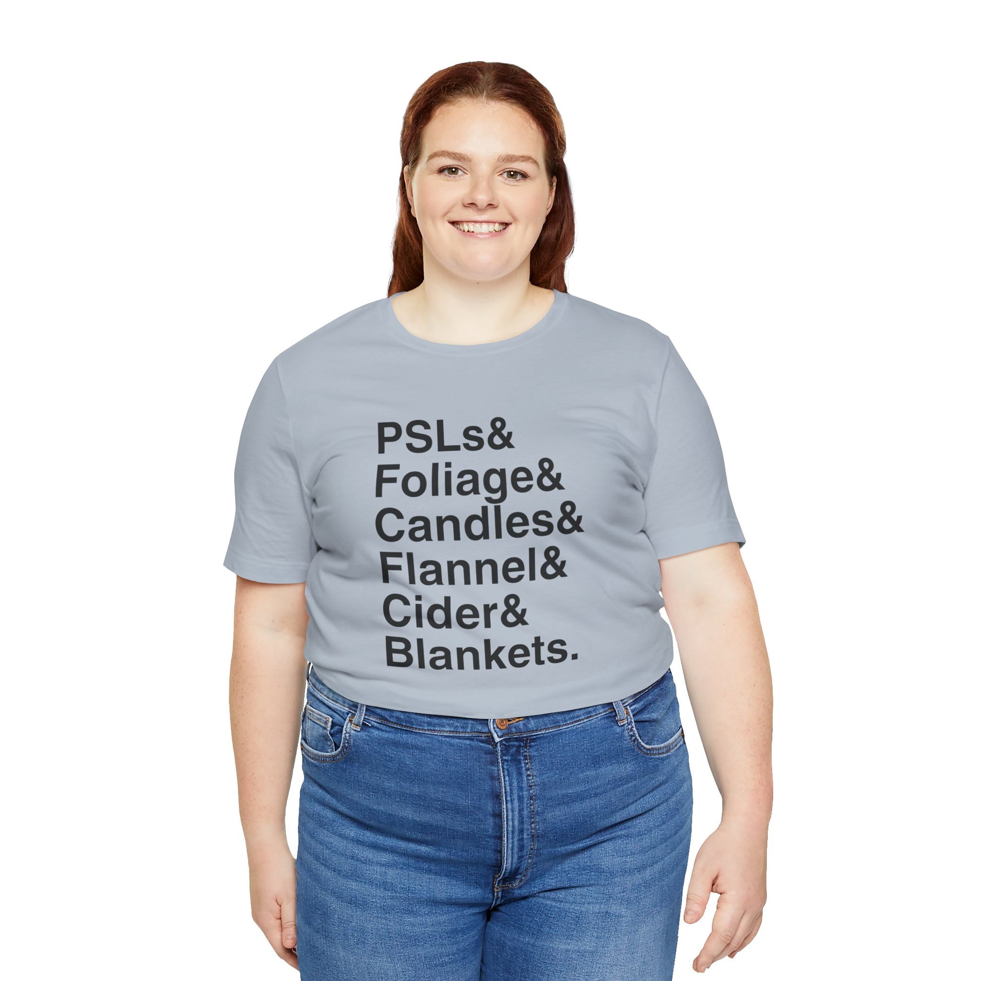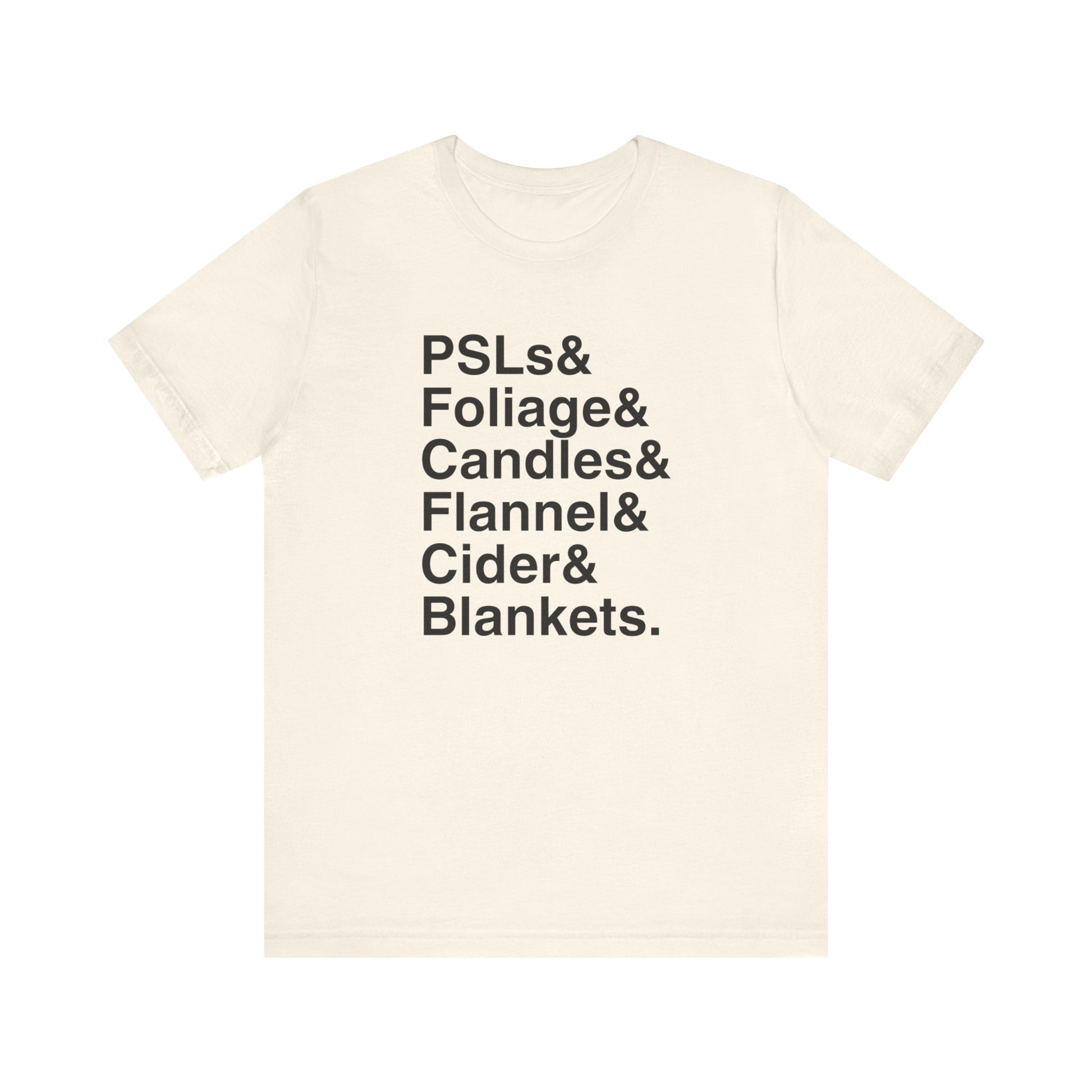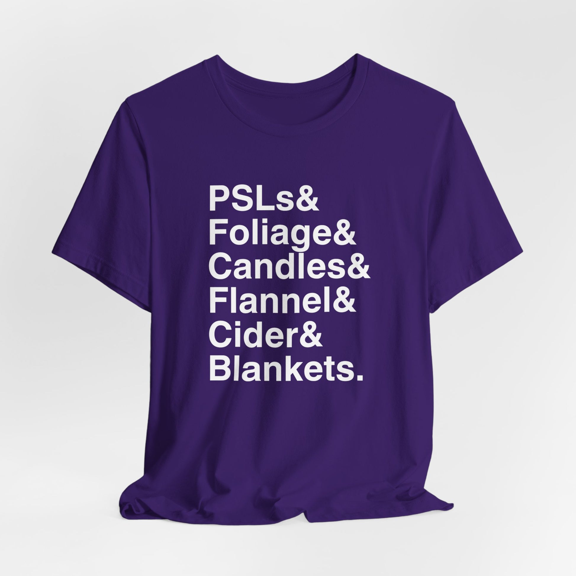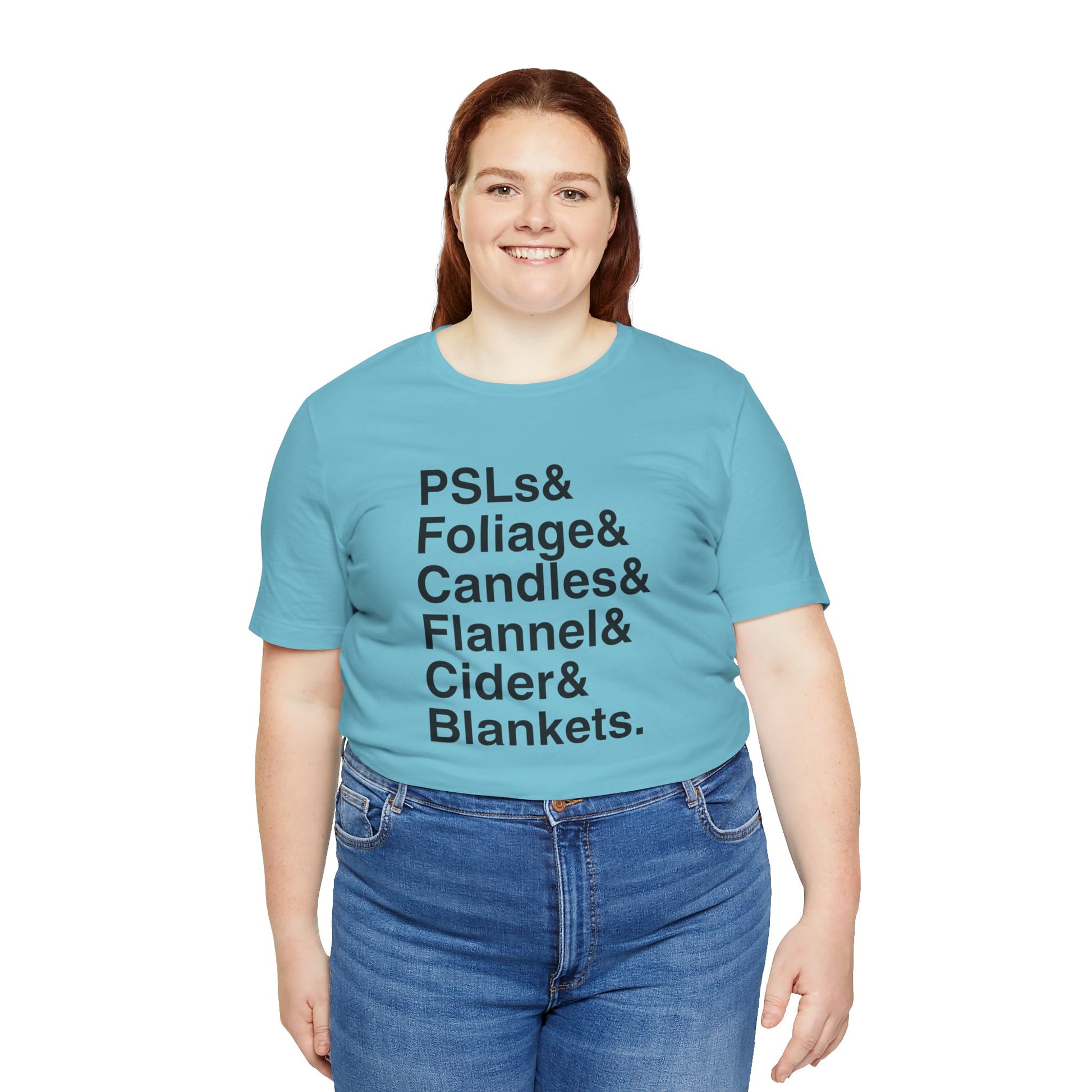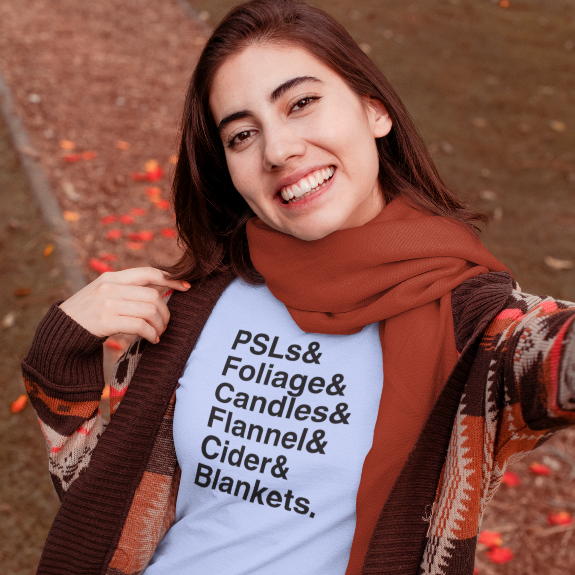Picture yourself stepping out to admire the foliage, a cup of cider warming your hands. This shirt embodies all of these sensations, making it the perfect gift for anyone who revels in the magic of autumn. So why wait? Make this fall season unforgettable with a shirt that celebrates your love for PSLs, foliage, candles, flannel, cider, and blankets. It's not just a shirt; it's a wearable reminder of all the things that make fall truly special. Order now and let the spirit of autumn fill your days and nights!