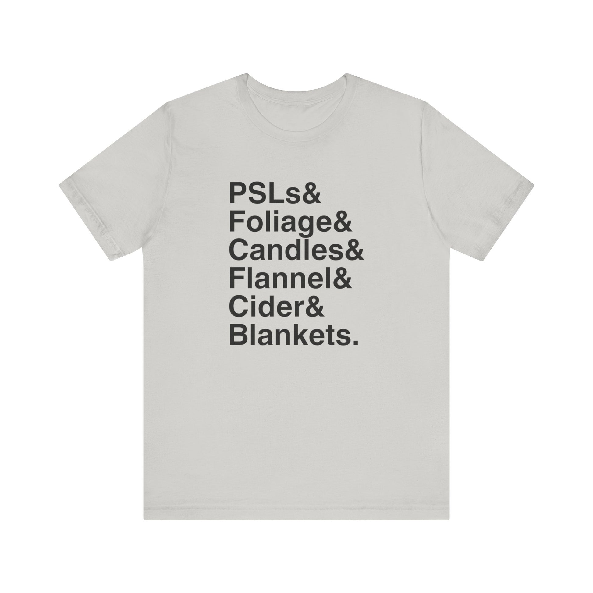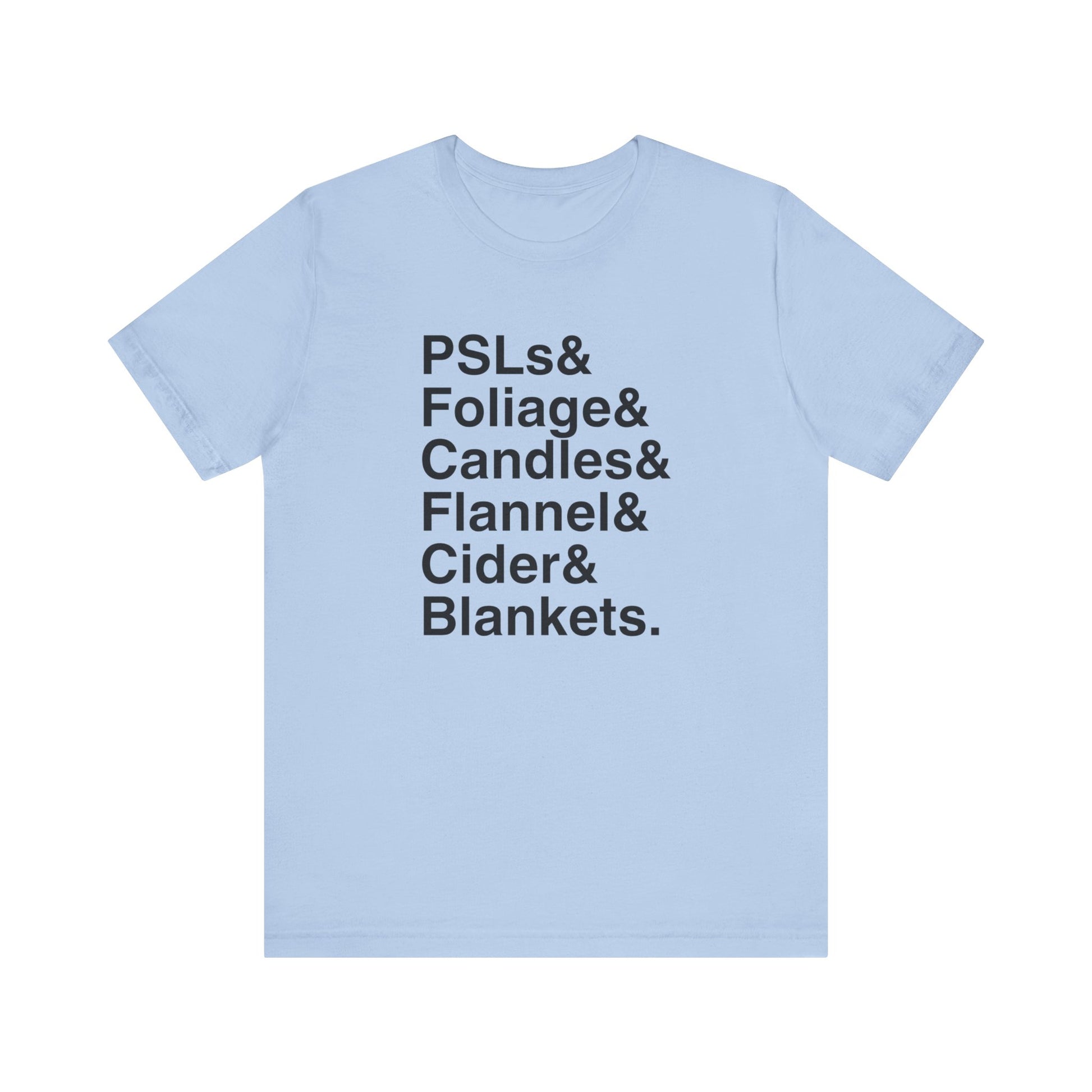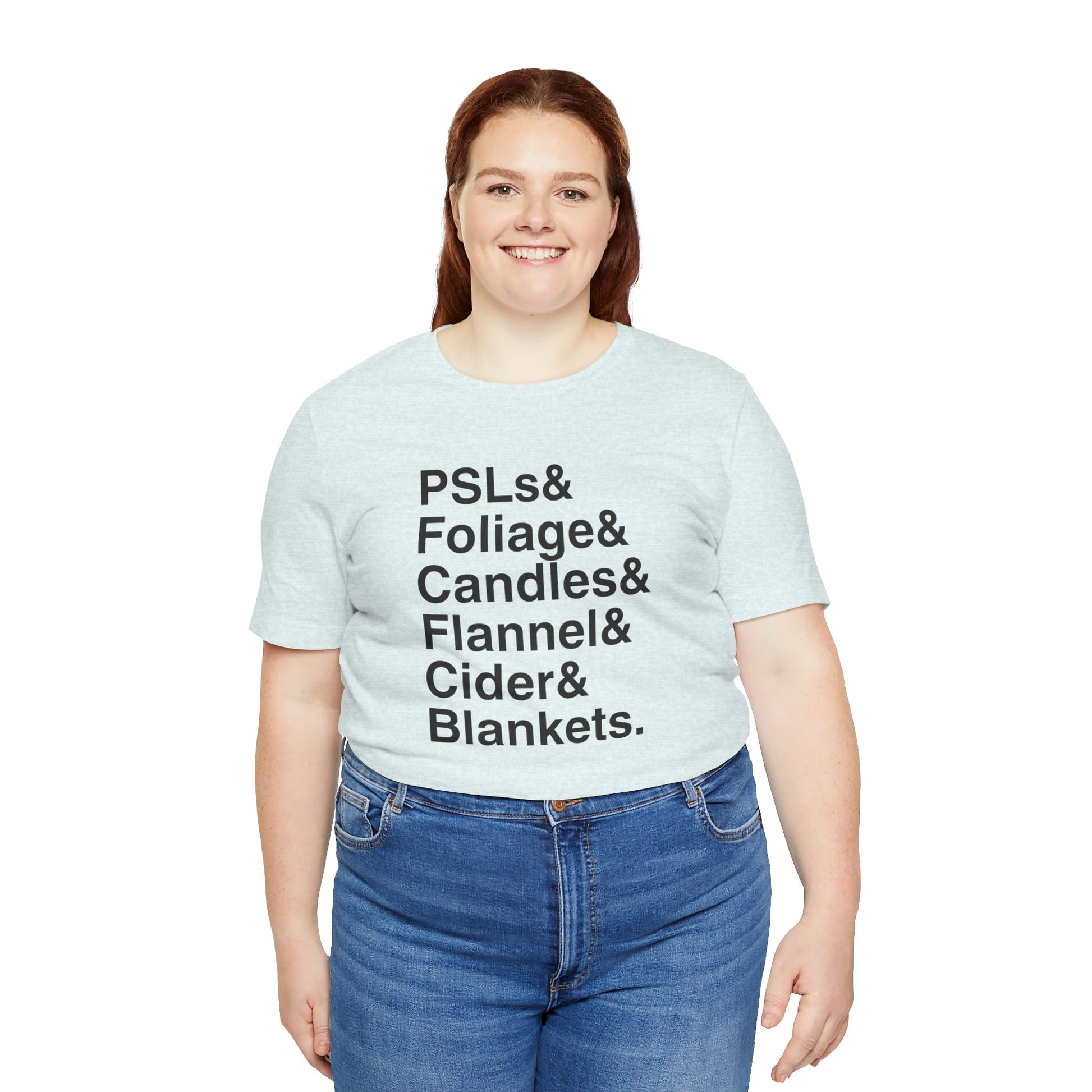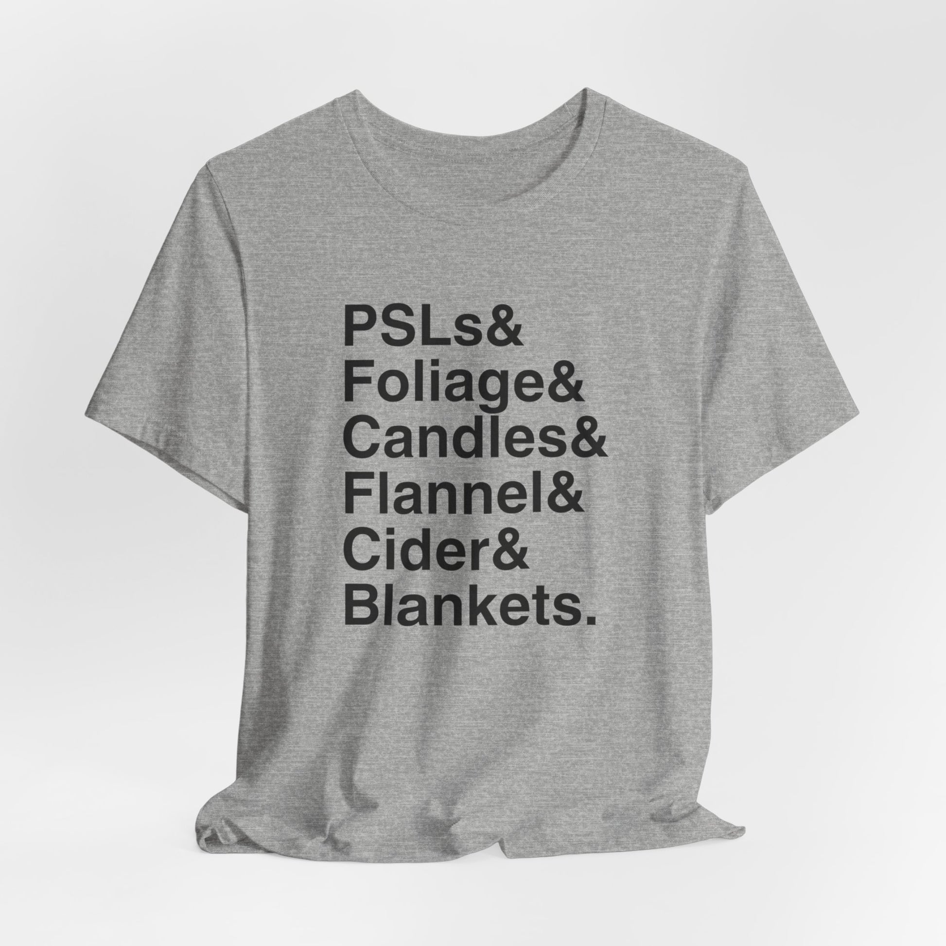 Picture yourself stepping out to admire the foliage, a cup of cider warming your hands. This shirt embodies all of these sensations, making it the perfect gift for anyone who revels in the magic of autumn. So why wait? Make this fall season unforgettable with a shirt that celebrates your love for PSLs, foliage, candles, flannel, cider, and blankets. It's not just a shirt; it's a wearable reminder of all the things that make fall truly special. Order now and let the spirit of autumn fill your days and nights!