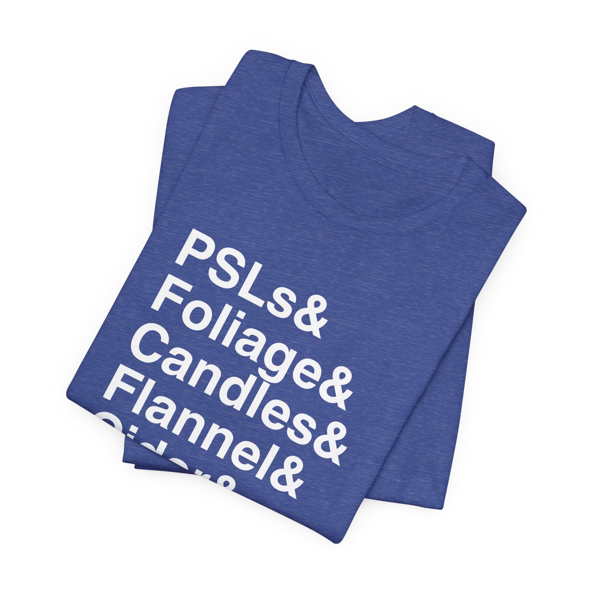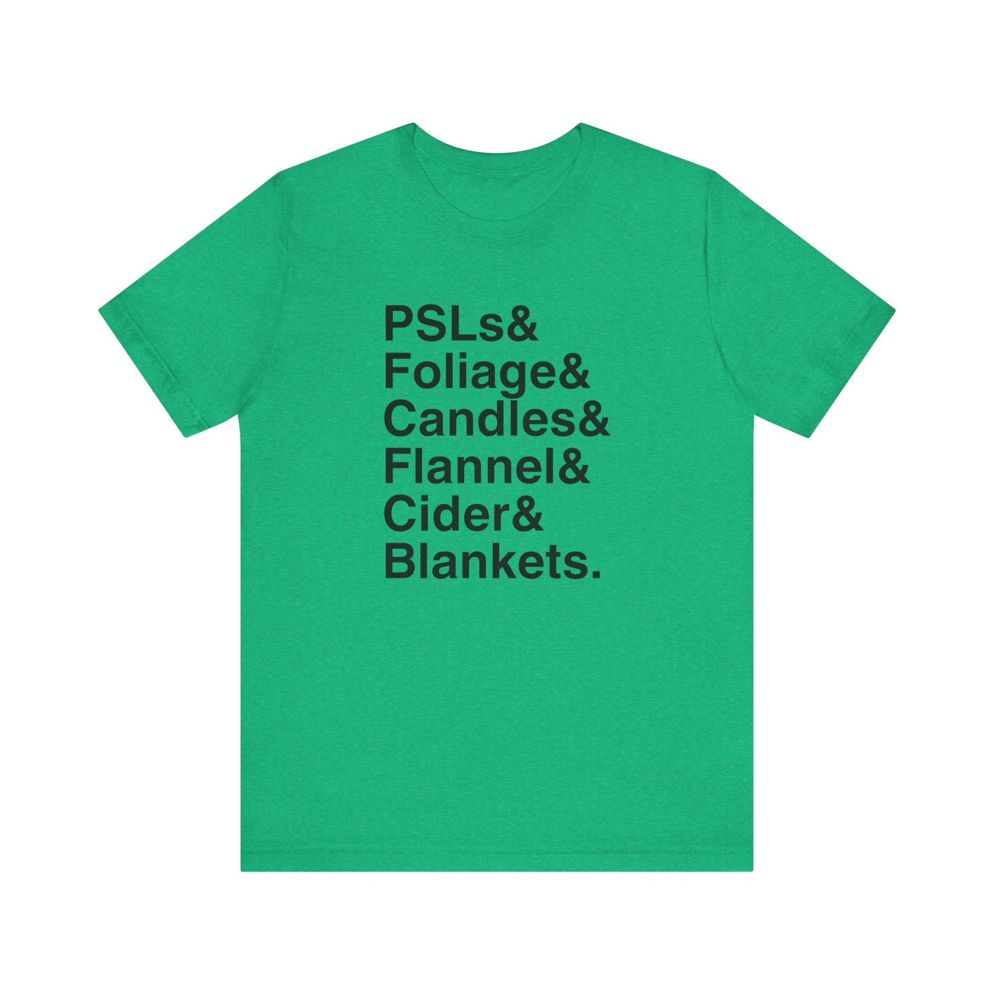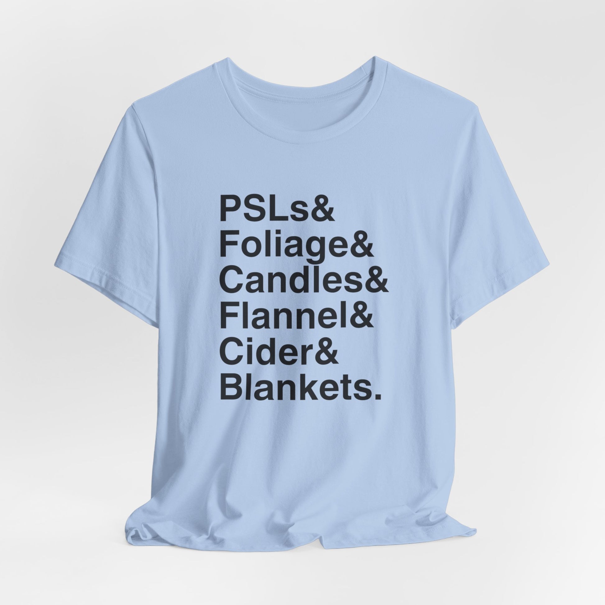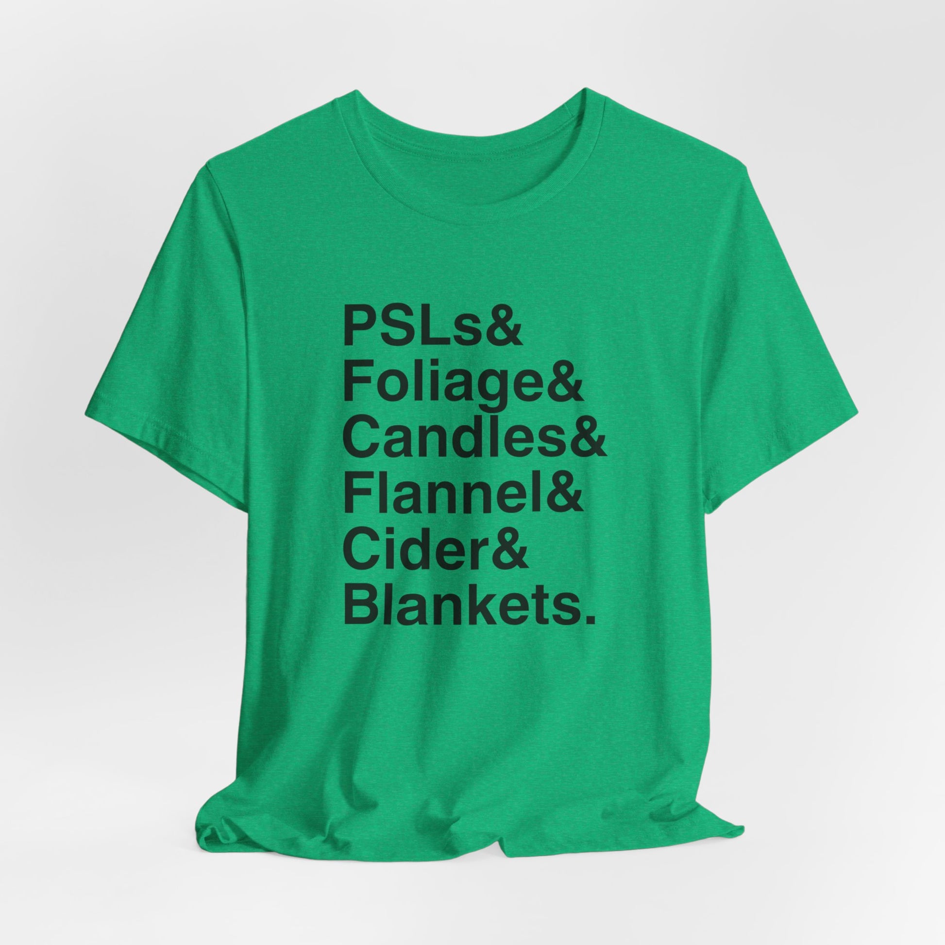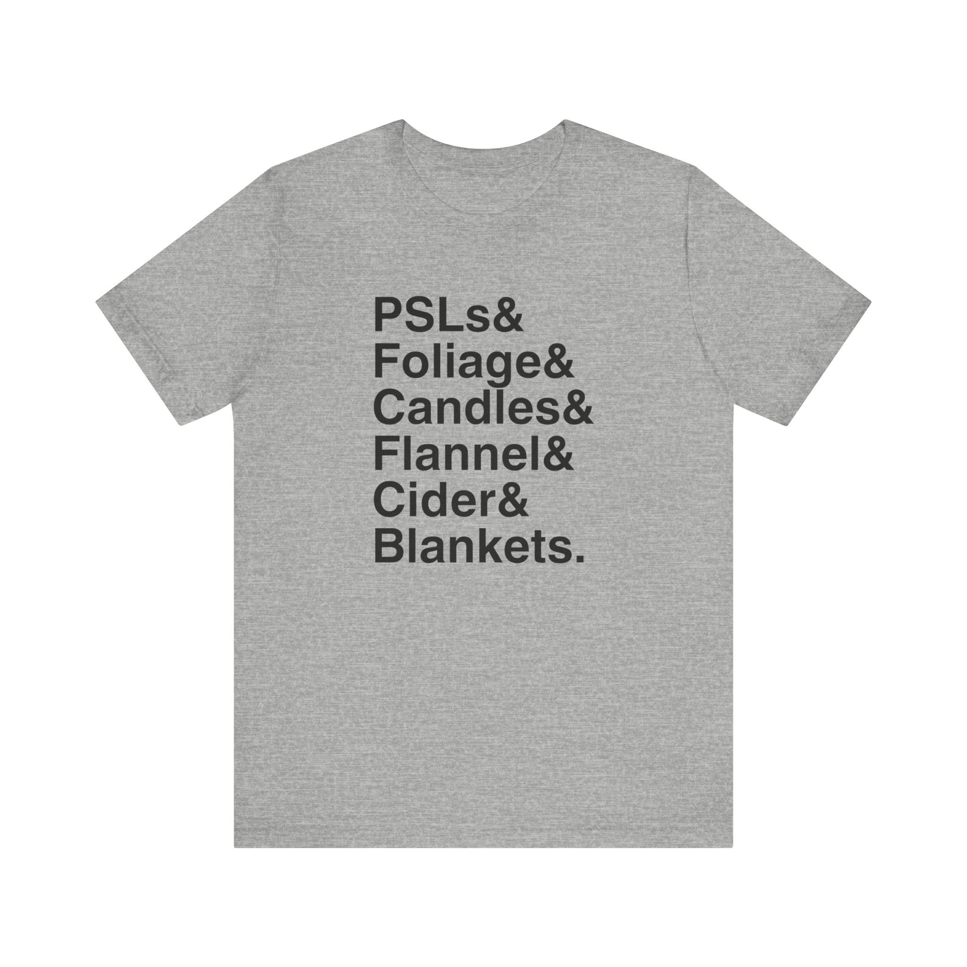 Picture yourself stepping out to admire the foliage, a cup of cider warming your hands. This shirt embodies all of these sensations, making it the perfect gift for anyone who revels in the magic of autumn. So why wait? Make this fall season unforgettable with a shirt that celebrates your love for PSLs, foliage, candles, flannel, cider, and blankets. It's not just a shirt; it's a wearable reminder of all the things that make fall truly special. Order now and let the spirit of autumn fill your days and nights!