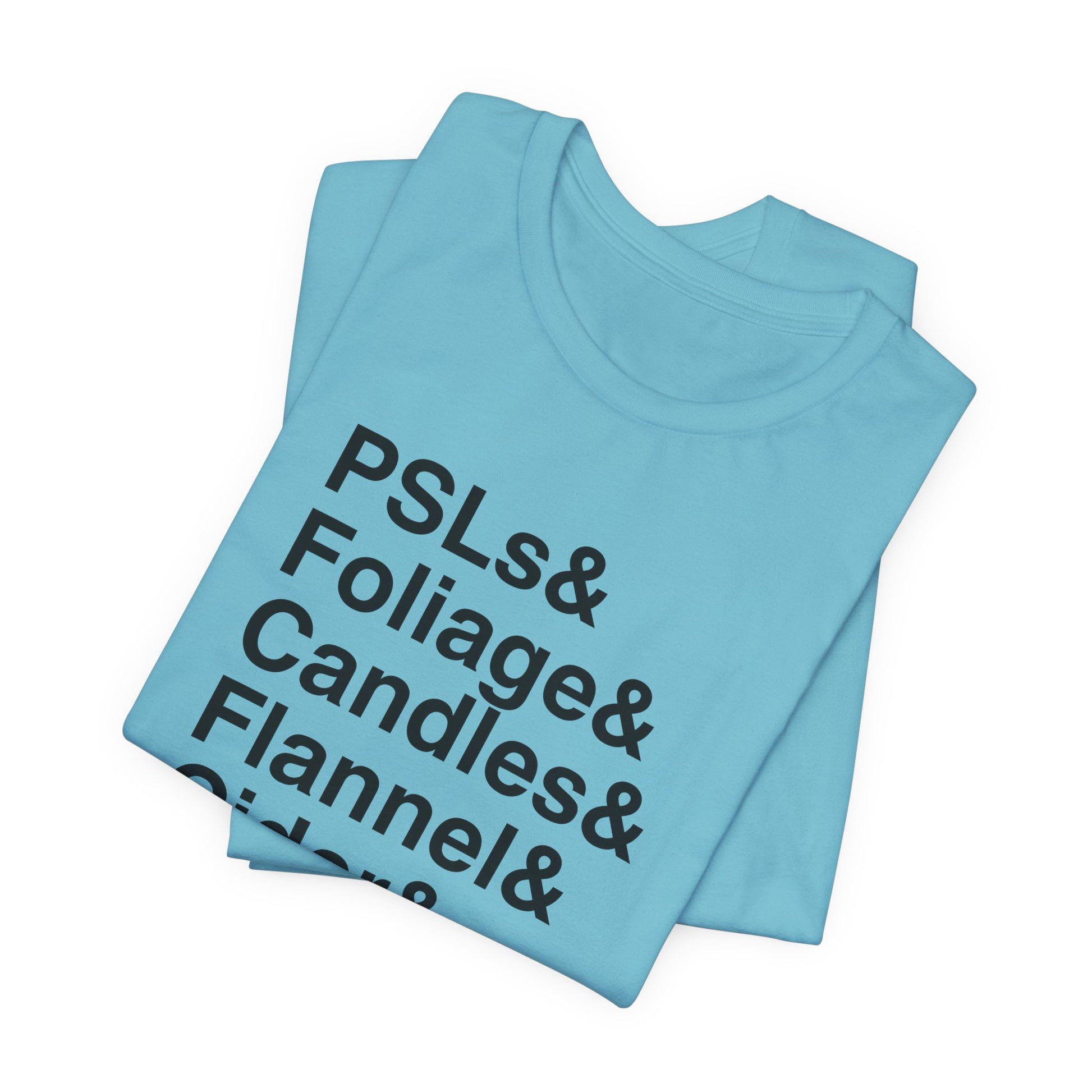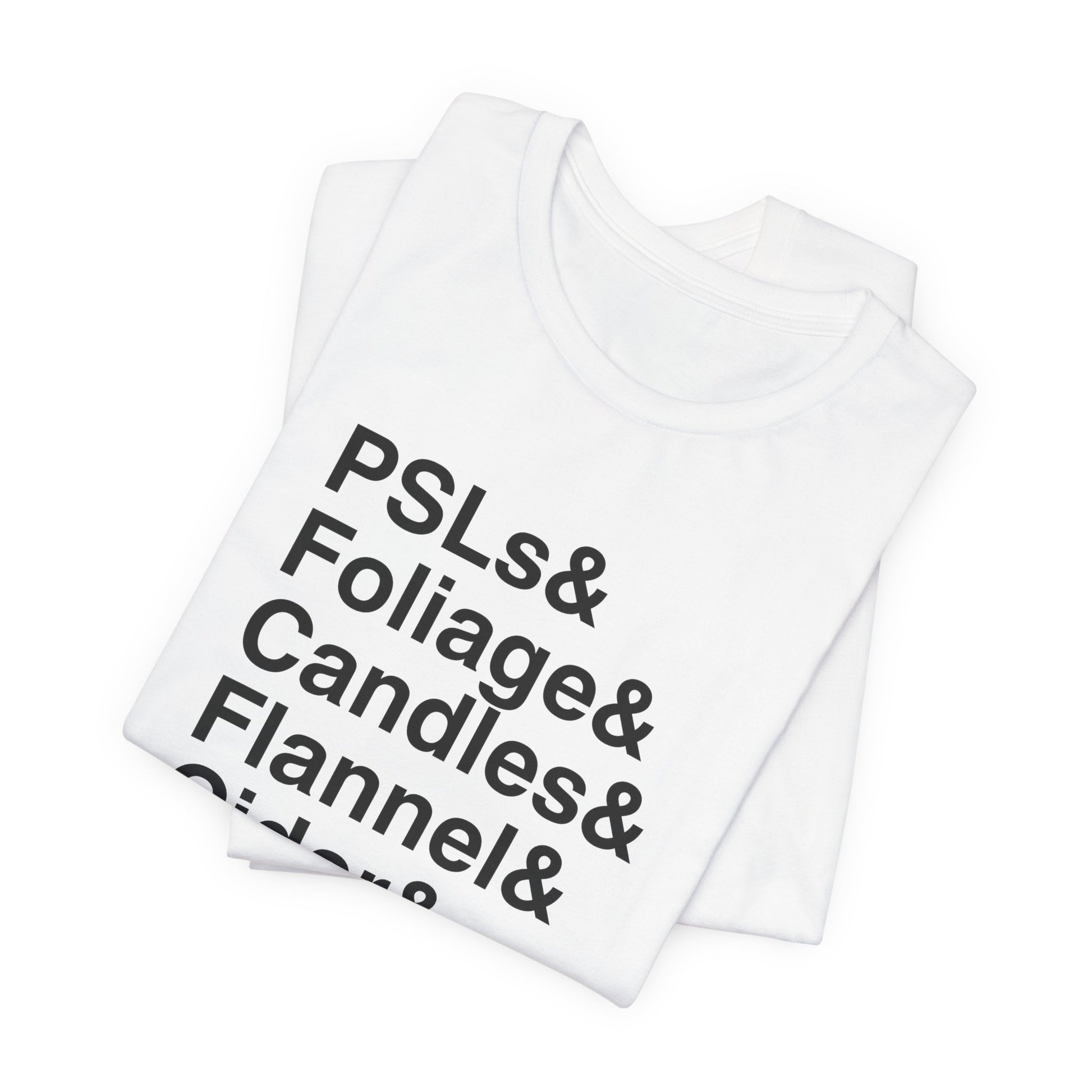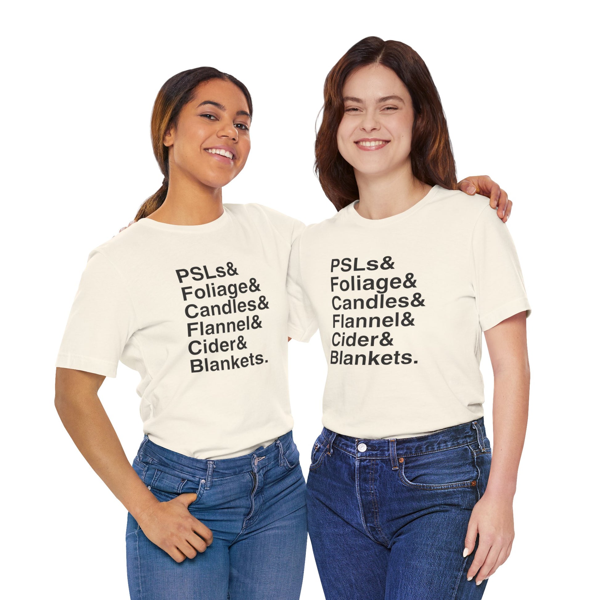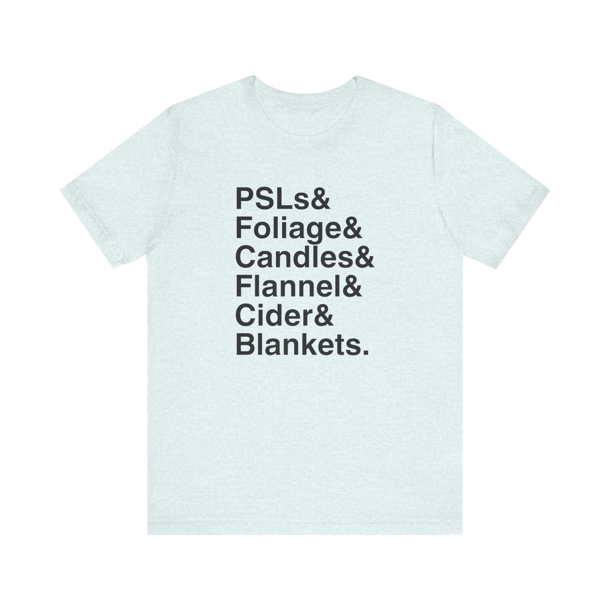 Fall Essentials Shirt: PSLs, Foliage, Candles, Flannel, Cider, Blankets, Perfect Cute Autumn Gift for Cozy Pumpkin Spice Season Enthusiasts