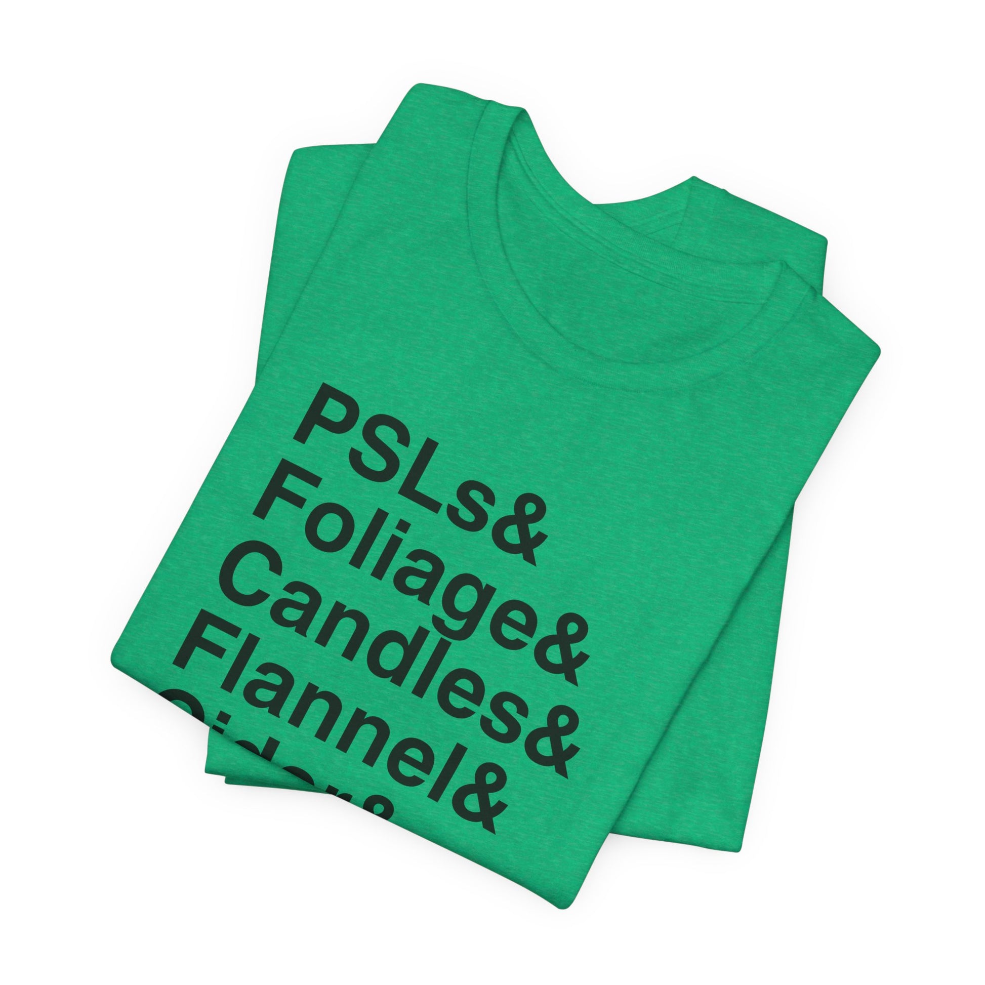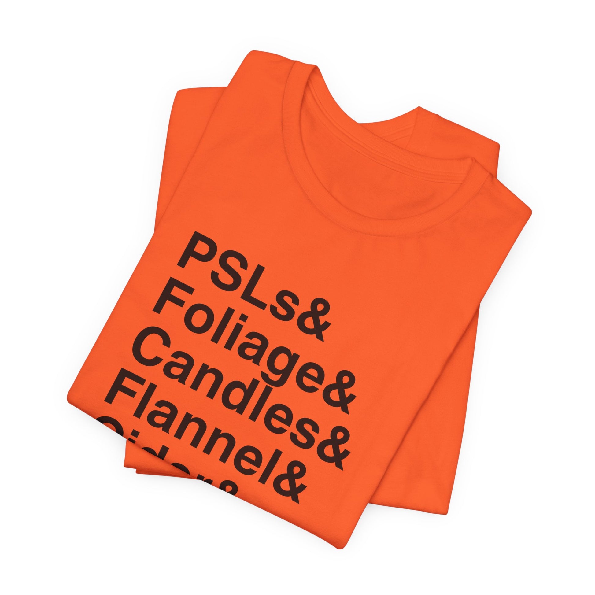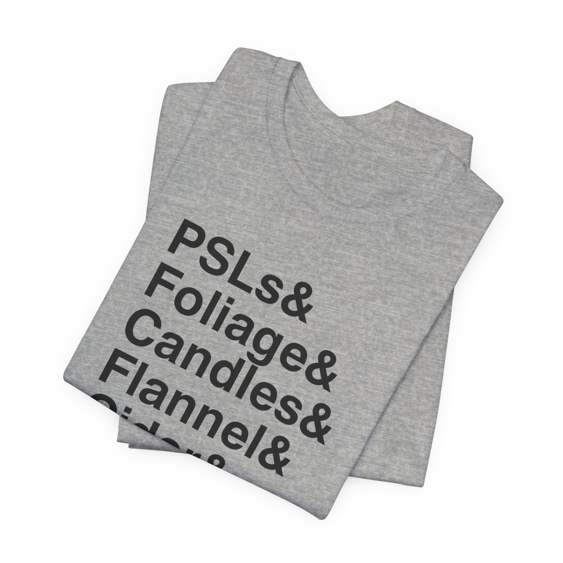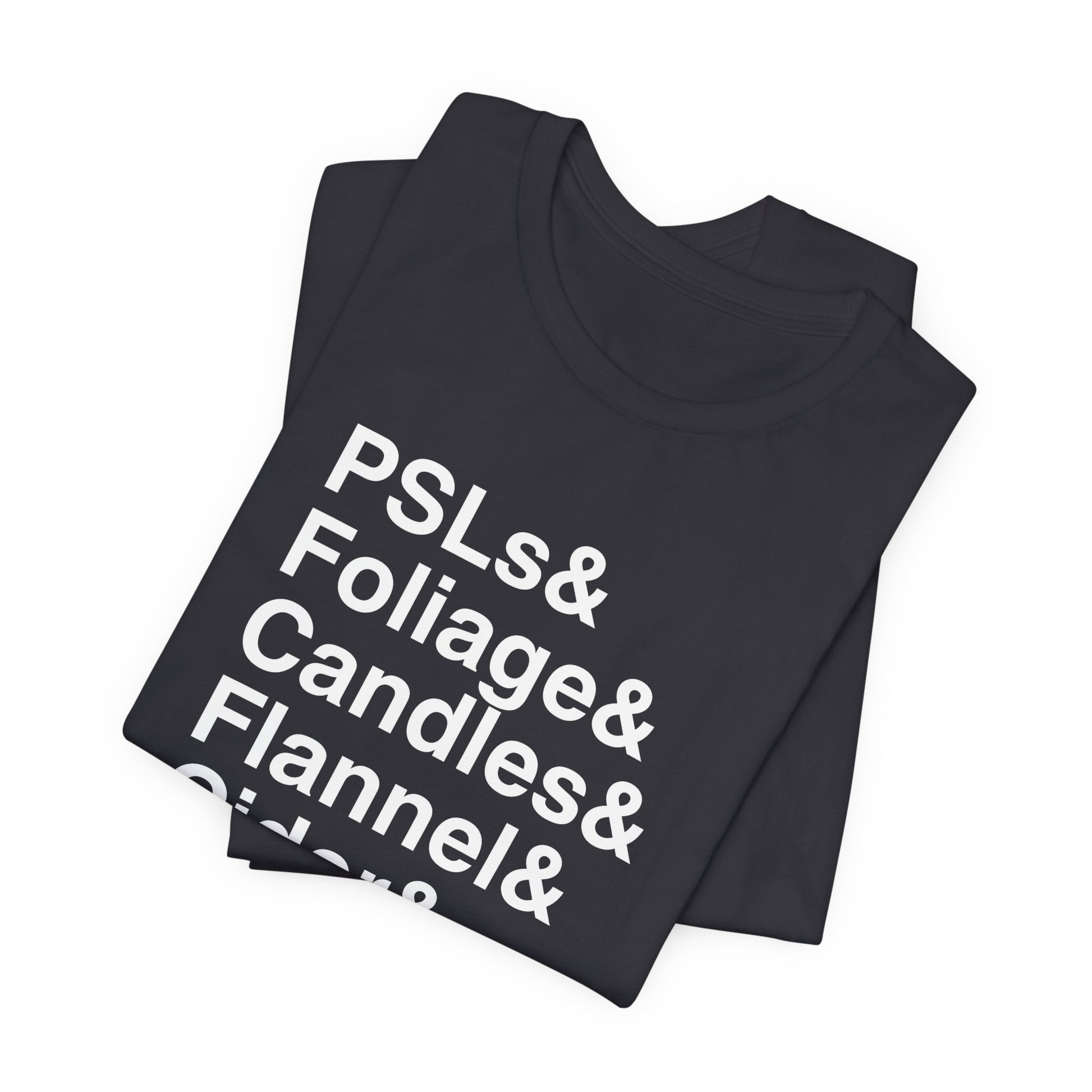 Fall Essentials Shirt: PSLs, Foliage, Candles, Flannel, Cider, Blankets, Perfect Cute Autumn Gift for Cozy Pumpkin Spice Season Enthusiasts